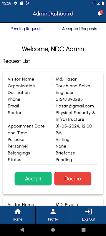 Diese Regierungs-App wurde entwickelt, um den Zugriffsprozess auf das National Data Center zu rationalisieren und zu sichern und so ein nahtloses Erlebnis für alle Benutzer zu gewährleisten. Egal, ob Sie ein Besucher sind, der Zugang sucht, ein Administrator, der Anfragen verwaltet, oder ein Sicherheitsadministrator, der Aufzeichnungen verwaltet, unsere App bietet die notwendigen Tools für eine effiziente und sichere NDC-Zugriffsverwaltung.