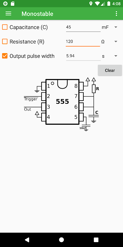 • Rechner zur Berechnung der Kapazität, des Widerstands oder der Ausgangsimpulsbreite im monostabilen Modus.
