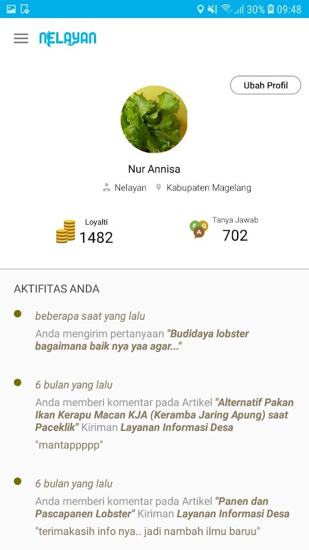 Aplikasi NELAYAN adalah aplikasi yang memberikan fasilitas tanya jawab seputar kegiatan nelayan dan perikanan baik budidaya maupun perikanan tangkap. Juga menyediakan artikel seputar dunia nelayan dan perikanan.