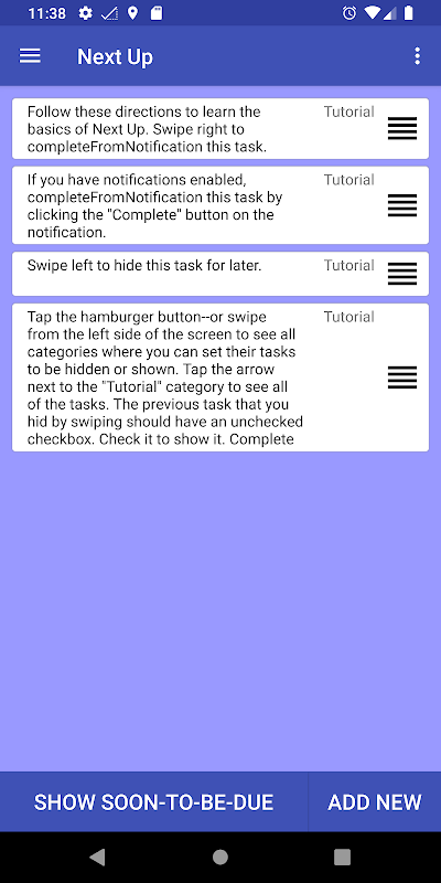 No matter how many categories and tasks you have, you will only have a notification for the task at the top of your list. It can be helpful to complete a to-do list One Step At A Time, so sometimes it nice to just know the one thing that is Next Up.