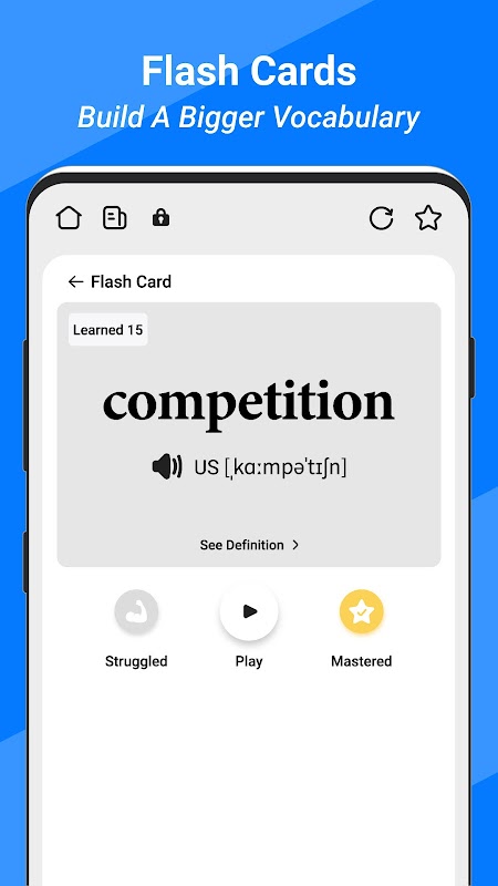Wenn Sie im Internet surfen, mit Freunden chatten oder online spielen, werden unbekannte Wörter, die gesucht werden, automatisch zu Ihrem Sprachführer hinzugefügt, um sie zu verfolgen. Eine Flash-Karte enthält eine detaillierte Definition mit Aussprache, die auf Knopfdruck verfügbar ist. Wenn Sie eine Sammlung von Wörtern zum Lernen erstellen, können Sie schnell Englisch verstehen.