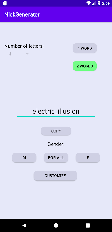 В правом углу выберите количество слов и нажмите на интересующий пол (мужской - "м", женский - "ж" или "для всех"). Если слово одно, то вы можете выбрать количество букв. После создания имени вы можете его кастомизировать, нажав на соответствующую кнопку. В конце нажмите кнопку "скопировать" , и процесс завершен.