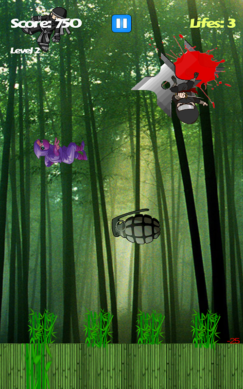 Slash and Tap screen to kill as many as Ninja to get scores. Don't slash granade that reduce your lifes. Many levels of games.