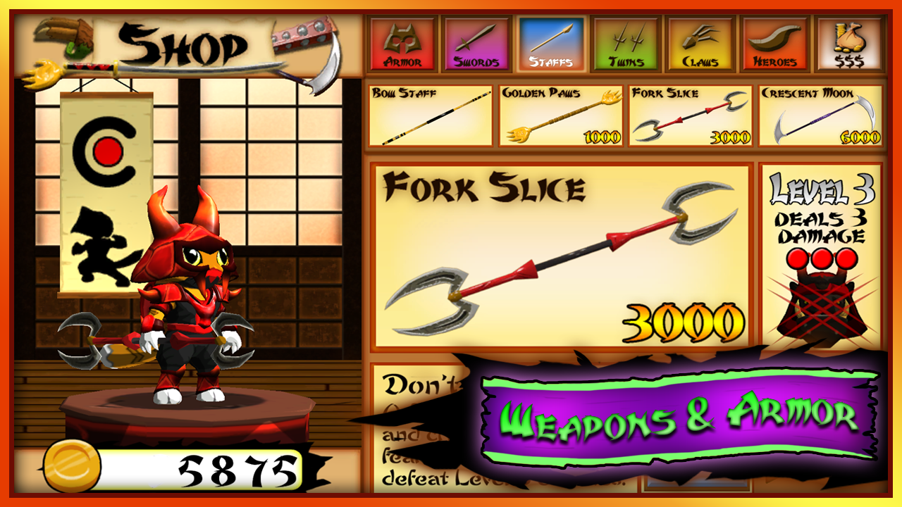 Du bist Ninja Kitty, die tödlichste und pelzigste Ninja-Kriegerin! Die Königlichen Kätzchen, die Erben der fünf Königreiche, wurden vom bösen Drachenkönig entführt! Es liegt an dir und den anderen Kitty Claws Ninjas, sie zu retten!
