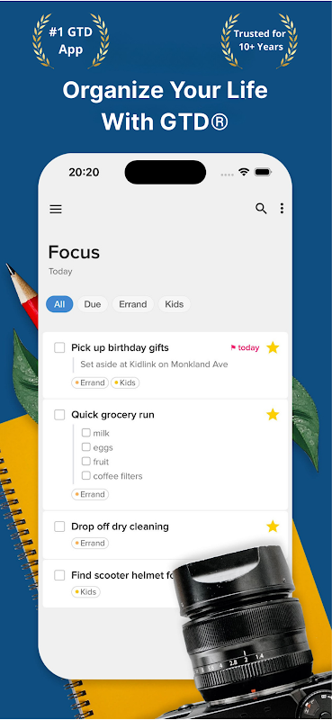 • Organisiere mit GTD-Listen wie Next, Waiting und Someday.