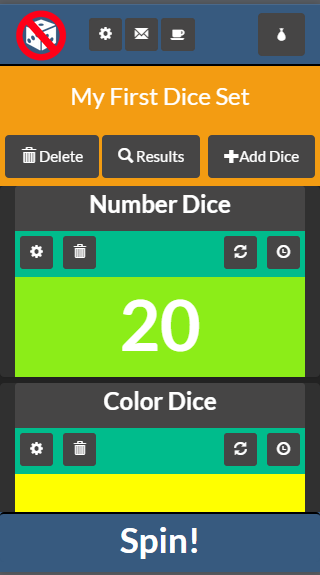 No Dice is an exciting way to spin dice. You can configure No Dice any way you want, then watch them spin like a slot machine. No Dice has numerous features that allow you to spin Numbers, Colors, or even words! No Dice also allows you to configure dice sets to trigger other dice based on results of others.No Dice has tons of features, start spinning now!.