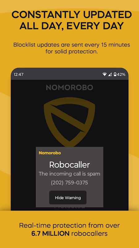Nomorobo blockiert lästiger robocalls, Telemarketing und Telefon Betrug. Bringt Frieden und Ruhe auf Ihr Handy zurück. Probieren Sie es für 14 Tage kostenlos - nur nach $ 1.99 / Monat.