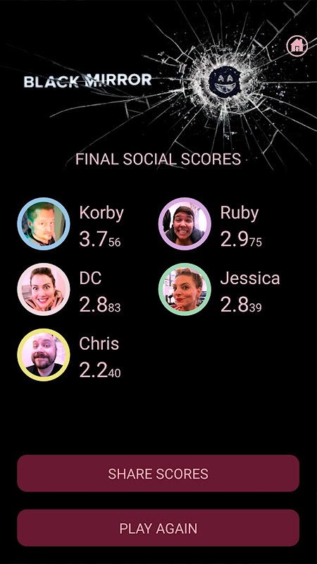 Die digitale Komponente des Brettspiels NOSEDIVE für soziale Interaktionen, mit dem Spieler Erfahrungen für einander auswählen können, die ihren Social Score erhöhen oder senken können.
