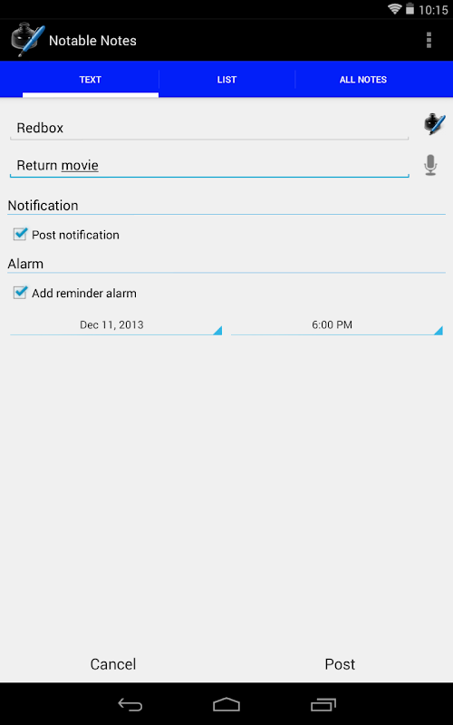 Quickly add notes to your notification bar to remind you of important things to do. Note icons are displayed in notification bar for high visibility every time you look at your phone. Notes will still be present after hitting "Clear" button on notification bar. Add reminder alarms to individual notes with user selectable ringtones. Share notes through email, text messaging, etc. Choose from 65 different icons for your notes.
