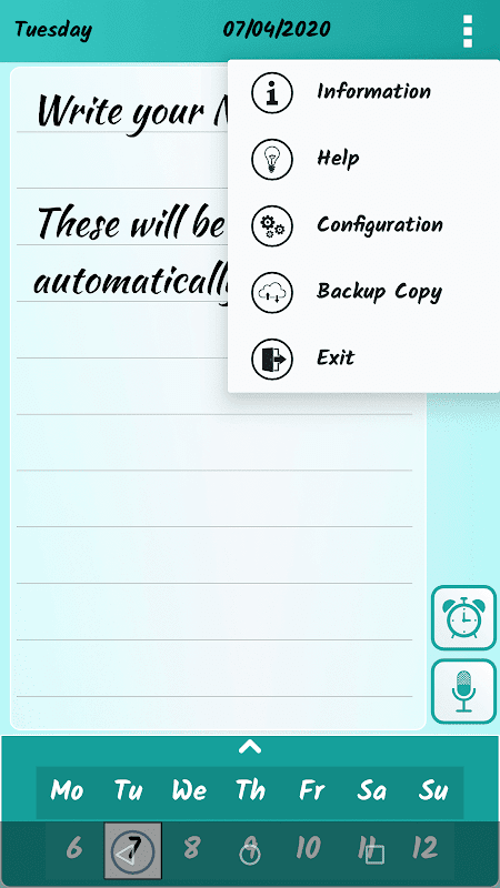 Note Day ist eine einfache Anwendung, mit der Sie Ihre Notizen von Tag zu Tag speichern können. Durch das Bearbeiten Ihrer Notizen erhalten Sie eine schnelle Erfahrung mit einer einfachen Benutzeroberfläche, Ihre Notizen werden automatisch gespeichert, Sie können die Tage schnell über den Kalender ändern oder indem Sie Ihren Finger auf dem Bildschirm von links nach rechts und umgekehrt bewegen. Speichern Sie Ihre Erfahrungen, Gedanken, Aktivitäten, Aufgaben ... was immer Sie im Laufe des Tages wollen.