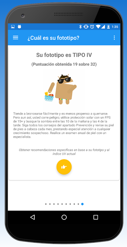 ▪ ¿Cuál es su fototipo?: Seleccionando respuestas para una serie de preguntas sobre su fisiología y su reacción ante la exposición solar, puede obtener rápida y cómodamente la clasificación de su piel, según el sistema de clasificación FizPatrick (reconocido por la comunidad dermatológica). Al final del test obtendrá una puntuación y una descripción sobre su fototipo. El tipo de piel que se determine en el test, será usado por otras funcionalidades de NoTeQuemes, para ofrecerle información y recomendaciones específicas sobre su piel, frente a la radiación UV.