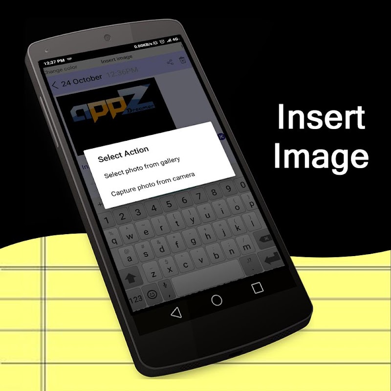 Fügen Sie eine Bildschaltfläche hinzu. Bei einem Klick erscheint ein Menü mit zwei Optionen, um ein Bild aus der Galerie auszuwählen oder ein neues Foto aufzunehmen. Wenn Sie zum ersten Mal auf die Schaltfläche klicken, fordert die Anwendung die Berechtigung zum Zugriff auf Kamera und Galerie an. Nachdem Sie ein Bild ausgewählt oder ein Foto aufgenommen haben, wird das Bild in eine Notiz eingefügt.