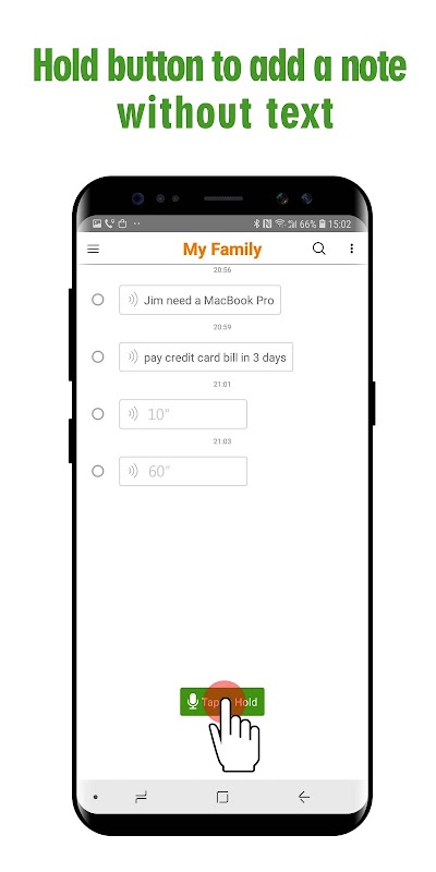 If your device is under poor network or noisy environment, just long press the button to record raw voice without calling recognition, which also you can add text note manually later.