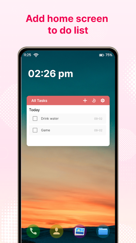 Greifen Sie mit unserem praktischen Widget jederzeit und überall auf Ihre To-Do-Listen zu. Fügen Sie das Widget zum Desktop Ihres Telefons hinzu, um schnell und einfach auf Ihre täglichen Aufgaben zuzugreifen. Markieren Sie Aufgaben direkt im Widget als erledigt, sodass Sie den Fortschritt mühelos verfolgen können.