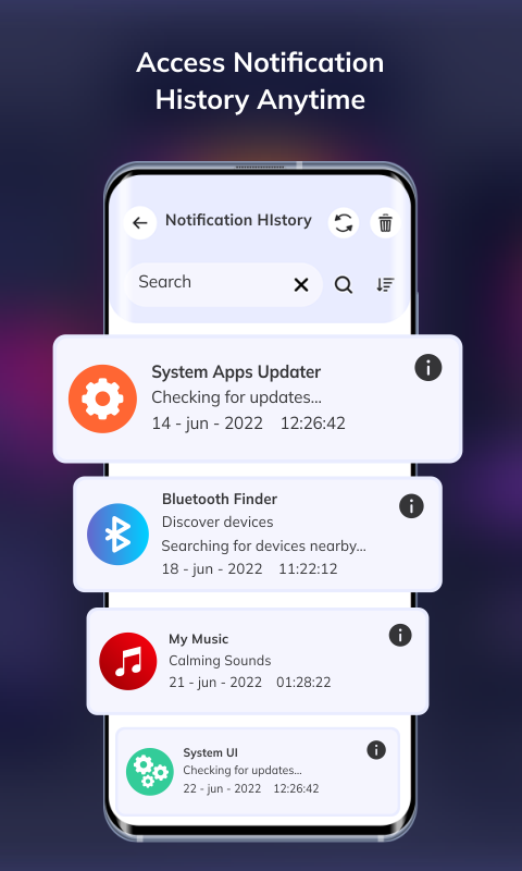 👉 Die Hauptseite ist der Verlaufsbildschirm. Sie können gelöschte Nachrichten und frühere Benachrichtigungen mit detaillierten Informationen anzeigen. Die leistungsstarke Suche hilft Ihnen, jede gespeicherte Benachrichtigung aus dem gesamten Benachrichtigungsprotokoll leicht zu finden.