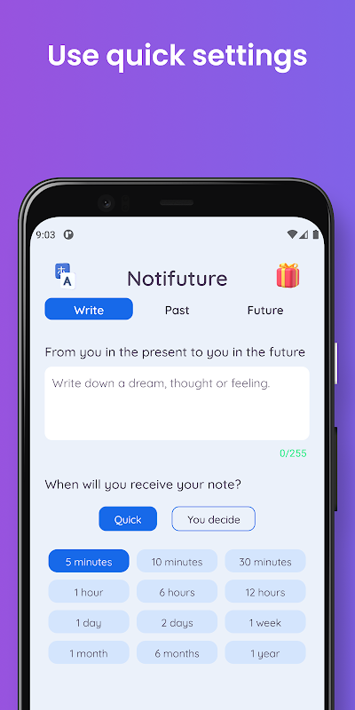Wählen Sie das gewünschte Datum und die Uhrzeit, bis zu einem Maximum von 1 Jahr. Oder machen Sie es sich mit einer schnellen Auswahl beliebter Voreinstellungen bequem. Das bleibt ganz Ihnen überlassen. Nachdem Sie die Zeit eingestellt haben, schreiben Sie Ihre Notiz und senden sie ab. Jetzt ist Ihre Notiz auf dem Weg zu Ihnen.