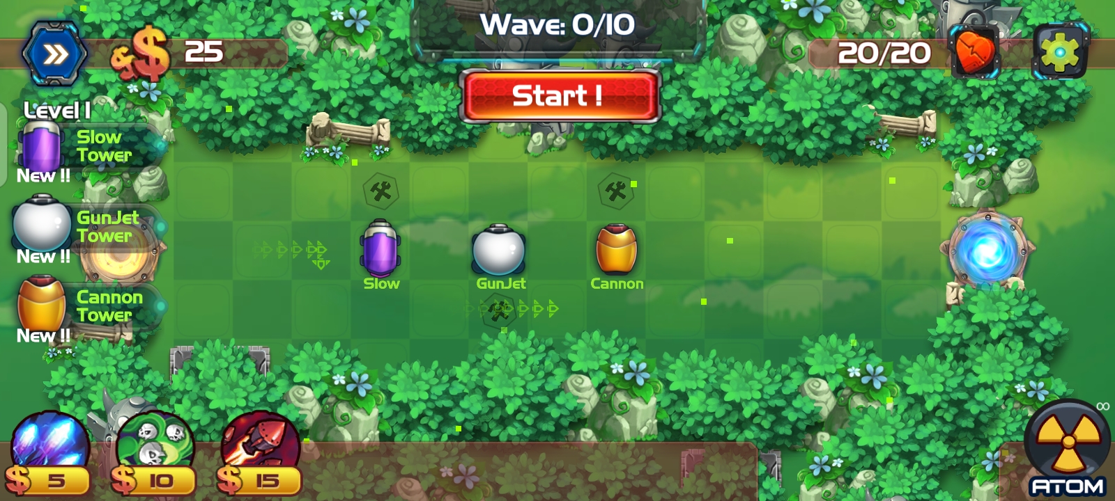Nova Defense ist ein fesselndes Tower-Defense-Spiel, in dem die Spieler ihre strategischen Fähigkeiten entfalten. Im Spiel stehen Sie Wellen unerbittlicher feindlicher Streitkräfte gegenüber und müssen Türme und Verteidigungssysteme geschickt platzieren, um ihren Angriffen standzuhalten und Ihre Basis zu schützen. Nutzen Sie eine Vielzahl von Türmen und Spezialfähigkeiten, um dem Feind verheerende Schläge zu versetzen. Da es mehrere Ebenen und Herausforderungen gibt, die jeweils Ressourcenmanagement, strategische Planung und Entscheidungsfindung in Echtzeit erfordern, müssen Sie in allen Aspekten hervorragende Leistungen erbringen. Indem Sie kontinuierlich neue Fähigkeiten verbessern und freischalten, können Sie eine beeindruckende Verteidigung aufbauen und im Kampf den Sieg erringen. Nova Defense bietet ein aufregendes und süchtig machendes Tower-Defense-Spielerlebnis, das Sie in die Welt der Strategie eintauchen lässt. Machen Sie sich bereit, die Herausforderung anzunehmen und Ihr Territorium zu verteidigen!