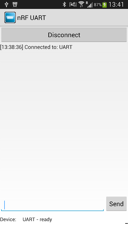 nRF UART kann verwendet werden, um eine Verbindung zu Bluetooth Low Energy-Geräten herzustellen, auf denen ein benutzerdefinierter Nordic Semiconductor UART-Dienst ausgeführt wird. Wenn eine Verbindung besteht, kann die App ASCII- und UTF-8-Textzeichenfolgen senden und empfangen.