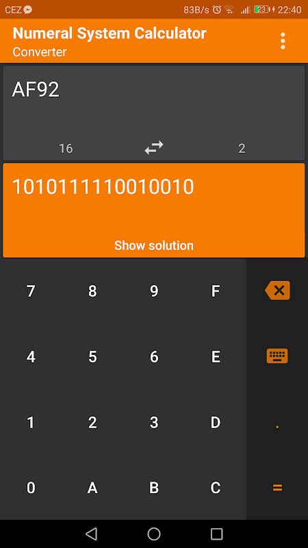 Numeral Converter + Calculator ist eine einfache und intelligente Anwendung zum Berechnen und Konvertieren von Zahlen zwischen numerischen Systemen. Die Anwendung kann beliebig lange, dezimale oder negative Zahlen zählen und sie zwischen Systemen konvertieren. App kann den Lösungsalgorithmus anzeigen. Es unterstützt System mit Basen von 2 bis 36.