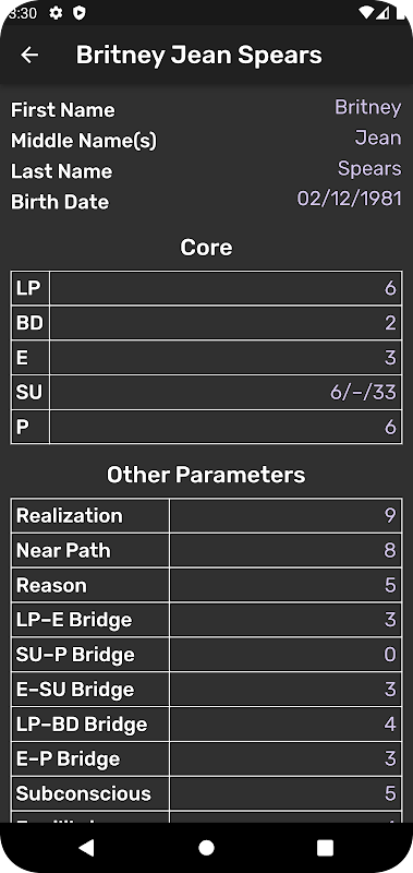 Um die numerologischen Parameter für die Person zu bestimmen, die Sie interessiert, erstellen Sie einen Eintrag für sie oder ihn (nachdem Sie auf die Schaltfläche in der unteren rechten Ecke des Bildschirms geklickt haben). Geben Sie den Vornamen, den zweiten Vornamen und den Nachnamen (oder zumindest den Vornamen) der Person sowie das Geburtsdatum ein. Nachdem der neue Eintrag auf dem Hauptbildschirm erscheint, berühren Sie ihn und Sie sehen alle wichtigen numerologischen Parameter für diese Person. Der numerologische Kern wird in meinem Einführungskurs ausführlich besprochen, während alle anderen Parameter in den kommenden Kursen besprochen werden.