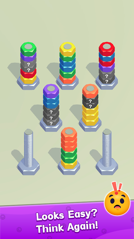 Teste deine Logik und Strategie in diesem unterhaltsamen Mutternsortierspiel. Tippe einfach, um die farbigen Muttern von einer Schraube zur anderen zu bewegen und sie präzise nach Farben zu sortieren. Klingt einfach? Denk nochmal! Mit jedem Level wird der Schwierigkeitsgrad gesteigert, sodass es spannender wird, die Farben perfekt zuzuordnen und das Sortierspiel zu lösen.