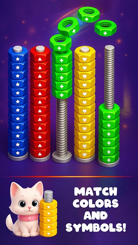 ✨ Farbenfrohe 3D-Grafik: Sieh zu, wie Muttern fliegen, sich drehen und einrasten.