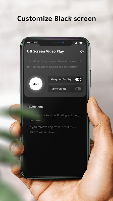 Turn ON the black screen for video play anytime and save the battery while listening to video sounds. Off screen video play can be used to listen to video music, podcasts, youtube videos, and many more.