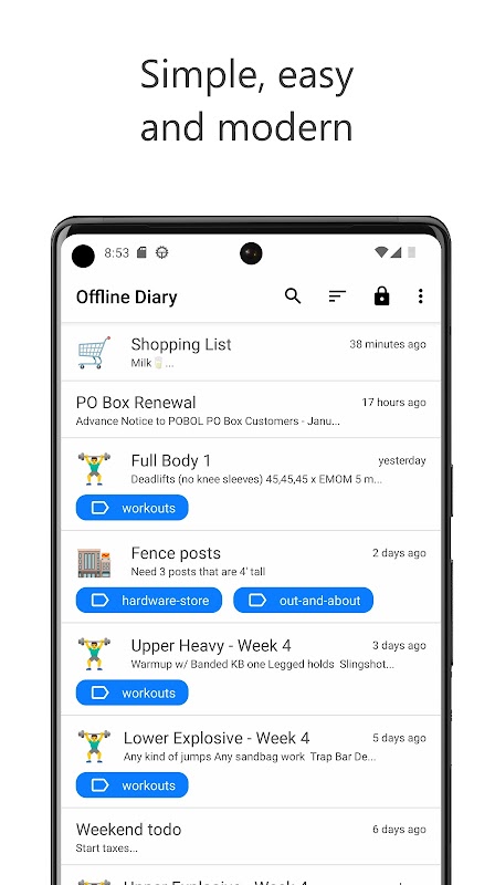 Sie möchten ein Tagebuch führen, trauen sich aber nicht, es online zu veröffentlichen? Das Offline-Tagebuch eignet sich perfekt für private oder berufliche Zwecke. Verwenden Sie es als Tagebuch, Journal, Notizblock oder Trainingsplaner! Sie können sogar Listen für Weihnachten, den Lebensmitteleinkauf oder Aufgaben erstellen.