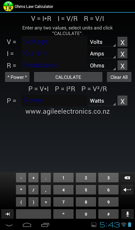 Diese kleine App ermöglicht es dem Benutzer einfach nicht das Ohmsche Gesetz Berechnungen, um Spannung, Strom und Widerstand berechnen. Es ist auch (optional) berechnet die zugehörige Verlustleistung Wert.