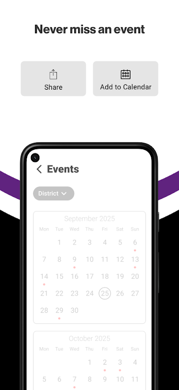 Der Veranstaltungsbereich zeigt eine Liste der Veranstaltungen im gesamten Bezirk. Benutzer können ihrem Kalender ein Ereignis hinzufügen, um das Ereignis mit nur einem Fingertipp mit Freunden und Familie zu teilen.