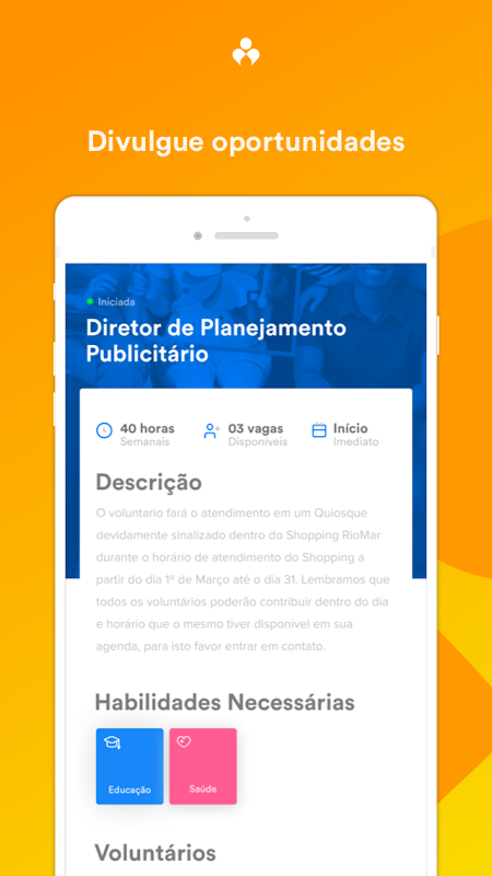 Neben der Schaffung von Arbeitsplätzen ermöglicht die Anwendung Organisationen die richtigen Freiwilligen zu den erstellten Auswahlen zu finden, die Eigenschaften zu suchen, die auf die Bedürfnisse jedes Vakanz erfüllen.