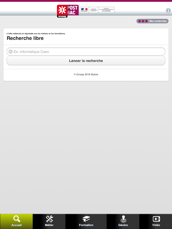 7 458 établissements, 12 352 formations, 395 métiers… L’application de l’Onisep aide le lycéen, l’étudiant à choisir ses études et sa profession future. CFA, BTS, DUT, école de commerce ou d’ingénieurs, universités… tous les diplômes post-bac sont accessibles via un moteur de recherche simple et performant.