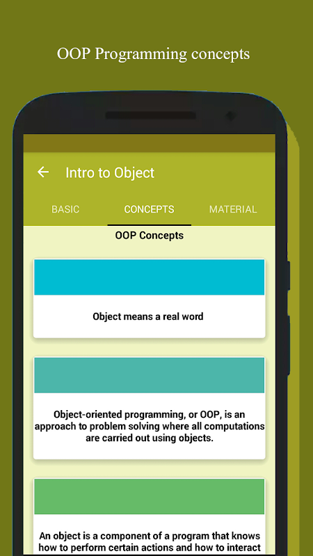 OOP Programming Concepts is an app especially developed for Beginner programmers which help the beginner students who want to learn the object oriented programming concepts in detail. Object Oriented Programming Concepts app is an app designed to teach you the fundamentals of Object-Oriented Programming based on Java.