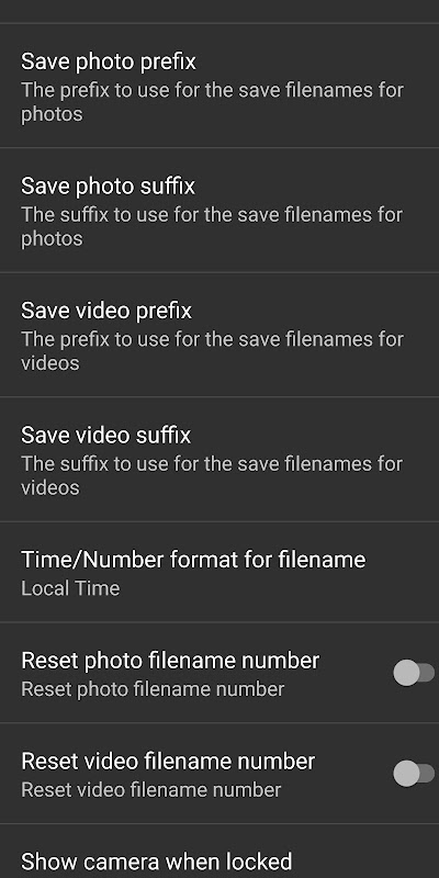 The Open Camera Remote app has Settings under More Camera Controls for photo and video filename suffix and Time/Number format for filename with reset. The suffix string appended to the filename helps you determine from which phone camera a photo was shot. This allows you to merge all the photos from multiple cameras into a single folder for editing.