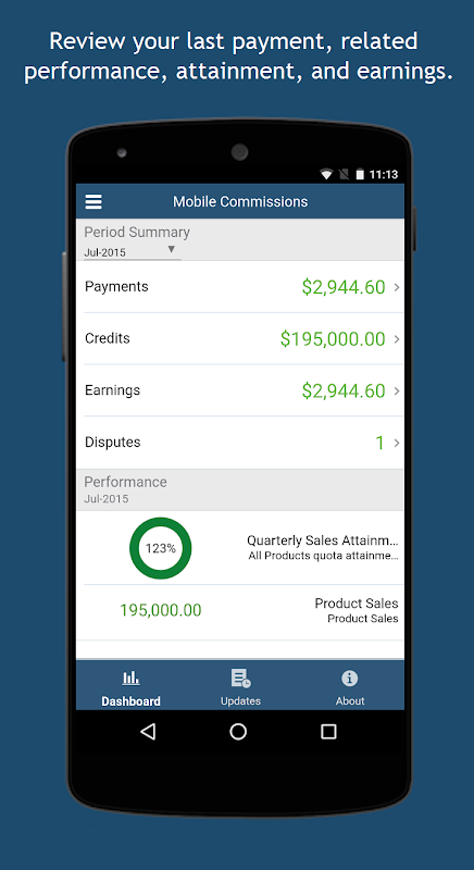 Sales people are able to view real time compensation data processed within the application. The Mobile Commissions application provides details from the last pay period such as payments (both commissions and bonus), payment balances, credit attainment, earnings, and performance. Sales people can also track their progress for the current period by viewing their latest credit attainment, earnings, and any payments processed to date.