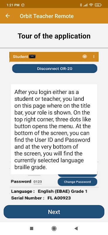 Die Orbit Teacher-Plattform ermöglicht es Lehrern in normalen Klassenzimmern, mit blinden Schülern über eine App auf einem Smartphone, Computer oder Tablet zu interagieren. Die App verbindet sich über Bluetooth mit der Braillezeile des Orbit Readers des Schülers und bietet eine Echtzeit-Textübersetzung der vom Schüler gelesenen oder geschriebenen Brailleschrift. Die neueste Version bietet jetzt die gleiche Funktion aus der Ferne über das Internet. Es ermöglicht dem Lehrer, die Braillezeile des Schülers anzuzeigen, das Gelernte zu überwachen und sogar auf dem Gerät des Schülers zu tippen und zu navigieren, ähnlich wie bei Bildschirmfreigabe-Software, die auf Computern verwendet wird.