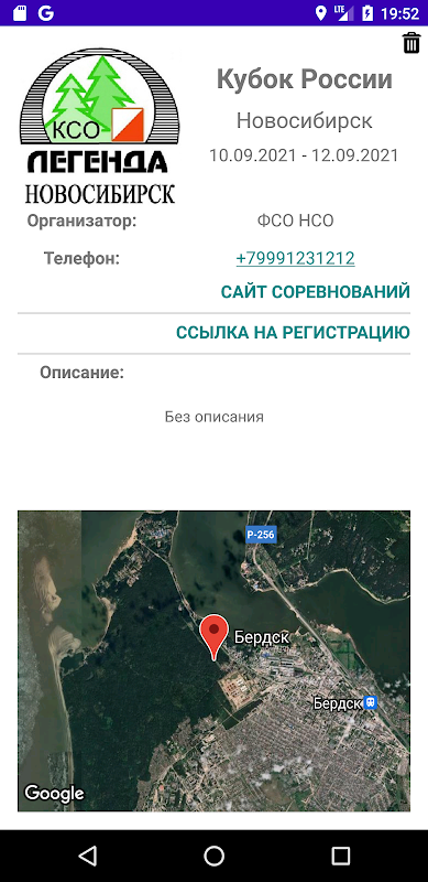 Außerdem hat die Anwendung die Möglichkeit, Benachrichtigungen für den Wettbewerb mit allen erforderlichen Informationen (Datum, Startort, Kontakte des Veranstalters, Links zur Website und Registrierung) zu erstellen.