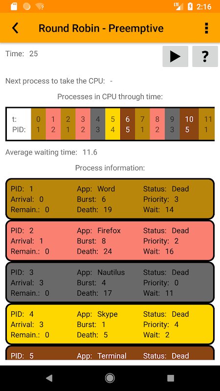 Um ein Betriebssystem genau zu verstehen, muss man wissen, wie diese Algorithmen funktionieren und warum einige vernünftige Ansätze von bekannten Betriebssystemen wie Windows oder Linux verworfen wurden. Das Ziel dieser Anwendung ist es, Erklärungen zu verschiedenen Ansätzen für jedes Problem bereitzustellen und anhand von Simulationen zu veranschaulichen, wie jeder Algorithmus funktioniert. Zu diesem Zweck enthält diese App einige Beispiele, aber Sie können auch Ihre eigenen Datensätze bereitstellen und überprüfen, wie sich die einzelnen Algorithmen auf diese auswirken würden. Es ist auch wichtig zu sagen, dass diese Anwendung in den meisten Fällen nicht die neuesten Algorithmen enthält, sondern Vereinfachungen, die wir für den Lernprozess als besser erachten.