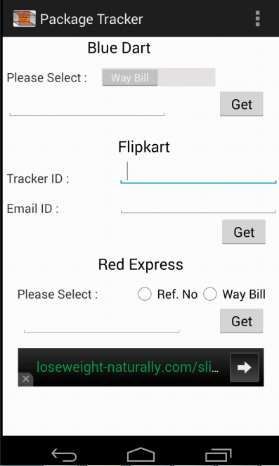 Simple app to track the order from few of the most widely used courier service i.e Blue Dart, FlipKart, Red Express. The current version of the app supports the above 3 package companies.