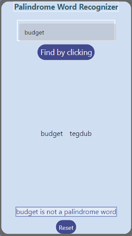 Die Palindrome Word Recognizer-App erkennt, ob ein Wort gleich ist, wenn es umgekehrt ist! Wenn ja, wissen Sie, dass es sich um ein Palindromwort handelt.
