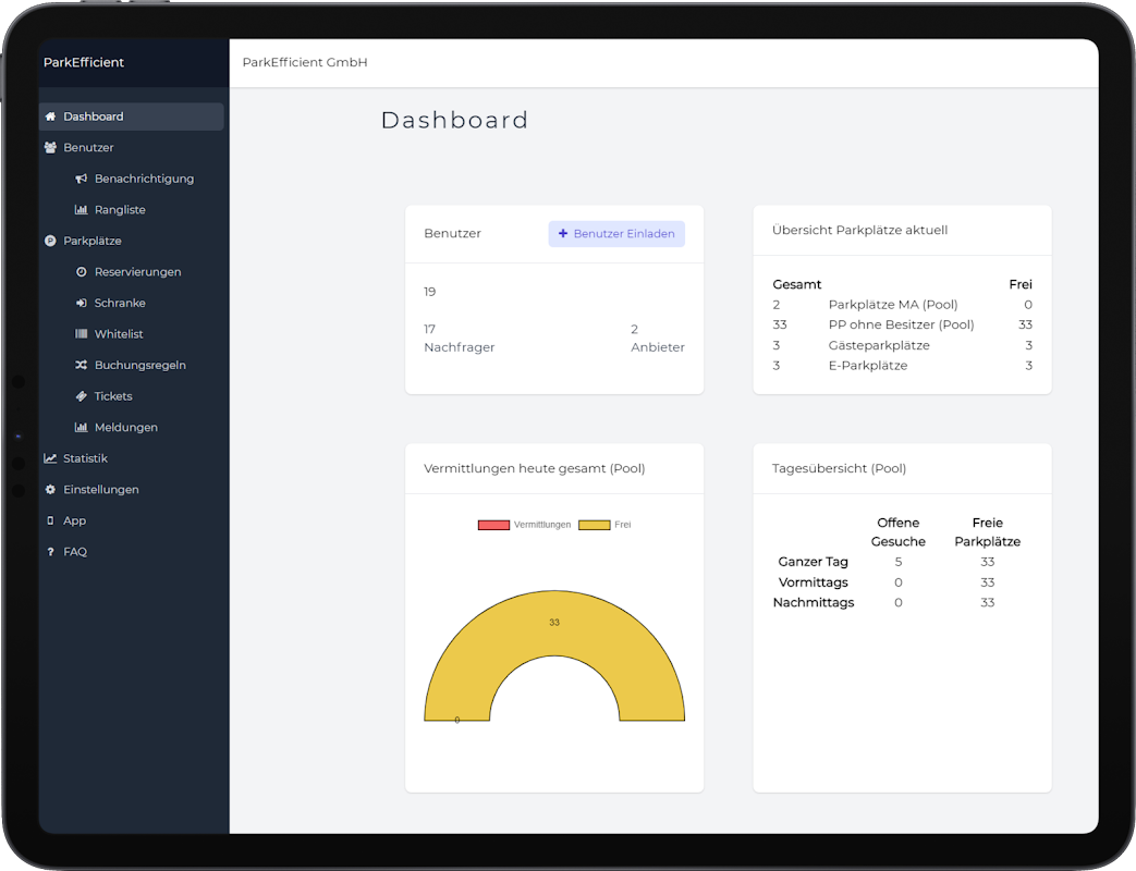 Ab sofort gehört langes Parkplatz suchen der Vergangenheit an. Durch unsere Anwendung lässt sich jede Unternehmensparkfläche digitalisiert verwalten und kapazitativ höchstmöglich auslasten. In der einfachen und intuitiven Oberfläche unserer App ist es für den:die Bediener:in ein Leichtes, sich schnell zu orientieren.