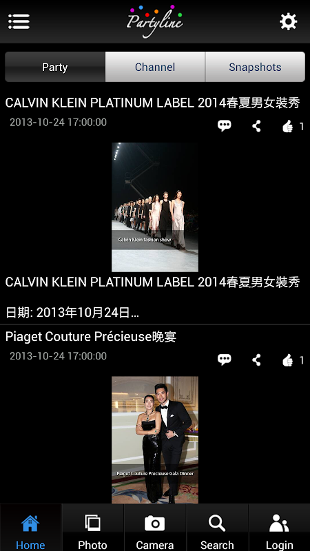 Partyline 是由《明報周刊》精心製作的應用程式,每日即時報導各大小城中矚目派對,實況報導品牌、時尚名人所舉行的派對熱鬧情況,第一時間將會場內的華麗佈置、衣香鬢影、時裝潮流、時尚產品以短片、相片作現場直擊報導。更同時與各界別專業人士如著名時裝設計師、形象設計師、化妝大師、及時尚名人,組成龐大派對大使隊伍,游走於各派對中,以其專業及個人角度,為讀者即時品評潮流趨向及上傳派對內獨家照片,使讀者更深入瞭解每個派對的細節。