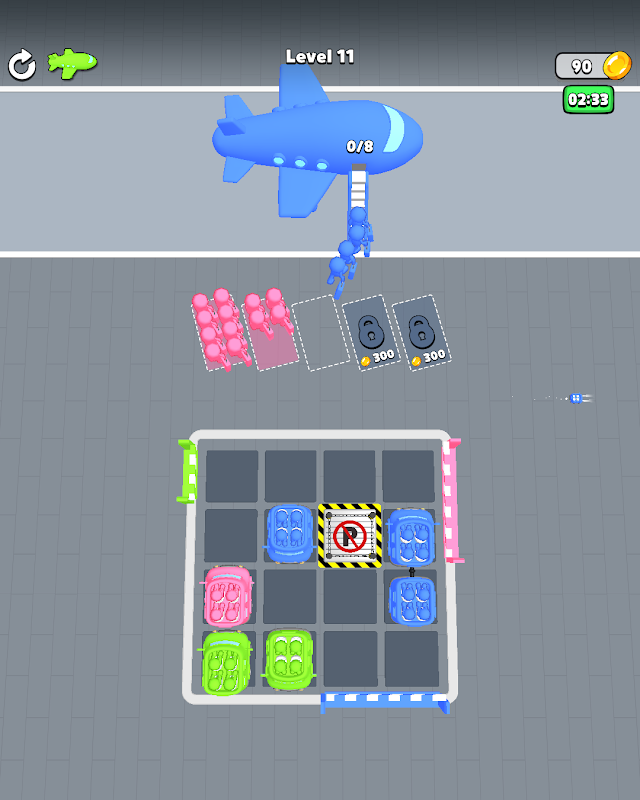 Farben zuordnen: Stelle sicher, dass Passagiere in Flugzeuge der gleichen Farbe einsteigen, indem du die Busse strategisch bewegst.