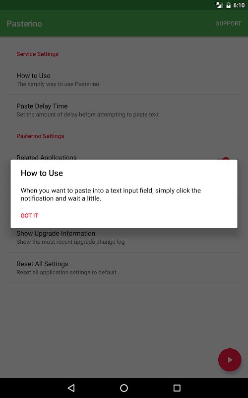Built to be super simple and extremely fast, Pasterino is small and requires few permissions to run. It only requires an Accessibility Service which allows it to run paste commands.