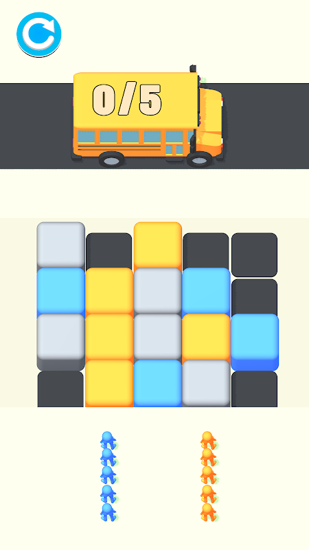 Führe die Charaktere über farbige Blöcke, um den Bus zu erreichen.