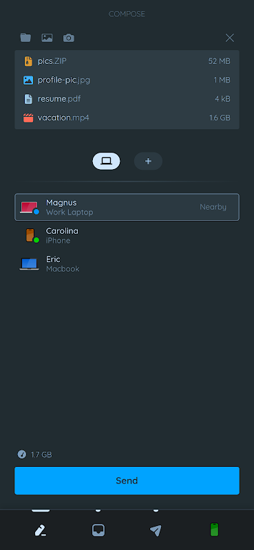 Übertragen Sie Dateien sicher und direkt zwischen mobilen oder Desktop-Geräten, so schnell, wie es Ihr Netzwerk zulässt. Fotos und Videos in Originalqualität, PDFs und alles dazwischen.