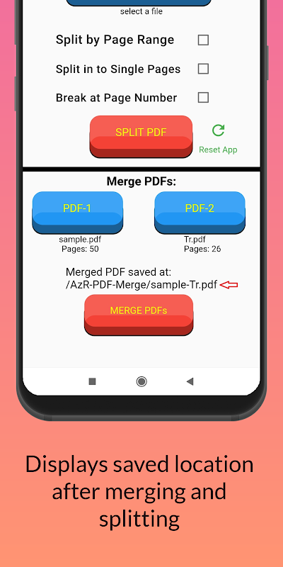 -Führt die obige Aufgabe sofort aus und speichert die geteilte oder zusammengeführte Datei in Ihrem lokalen Speicher (für Android Version 11 im internen App-spezifischen Speicher)