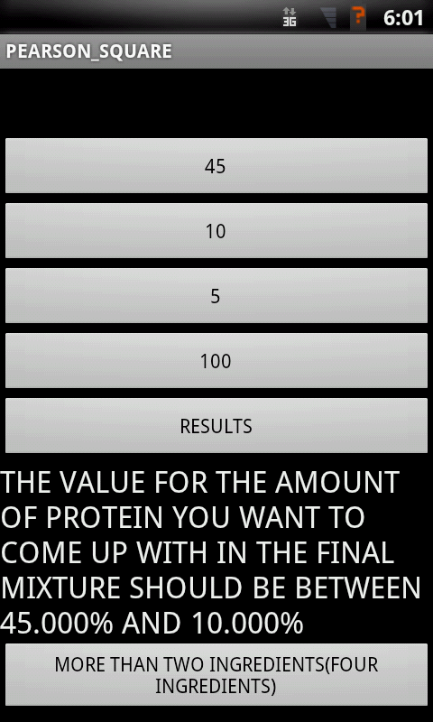 This is a very simple app that will enable you come up with a certain amount of food for your animals for example you may want to give your animal 35% protein but you may not be knowing how to mix the different ingredients to come up with the 35% proteins.So this app helps you in such problems. even when you have gotten 4 ingredients and you a looking for a way to mix them to get a certain amount of for example proteins this app can give you the values you need. all you have to do is to input the percentage amount of the different feeds and their crude protein values and you will obtain answers by clicking on certain buttons.