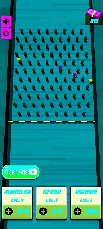 Jede fallende Murmel bringt Ihnen Gold ein und hilft Ihnen, Reichtum anzuhäufen. Mit den verdienten Münzen können Sie die Murmelanzahl und die Fallgeschwindigkeit erhöhen, wodurch Sie Ihre Ertragseffizienz steigern und mehr Geld verdienen.