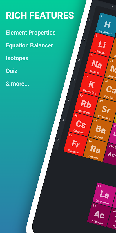 Periodensystem ist die beste kostenlose Anwendung für die Periodensystemchemie mit einem Gleichungsausgleicher auf dem Markt. Es hilft Ihnen, die Eigenschaften aller 118 chemischen Elemente des Periodensystems mit allen Details zu lernen und sich das Periodensystem-Quiz zu merken.
